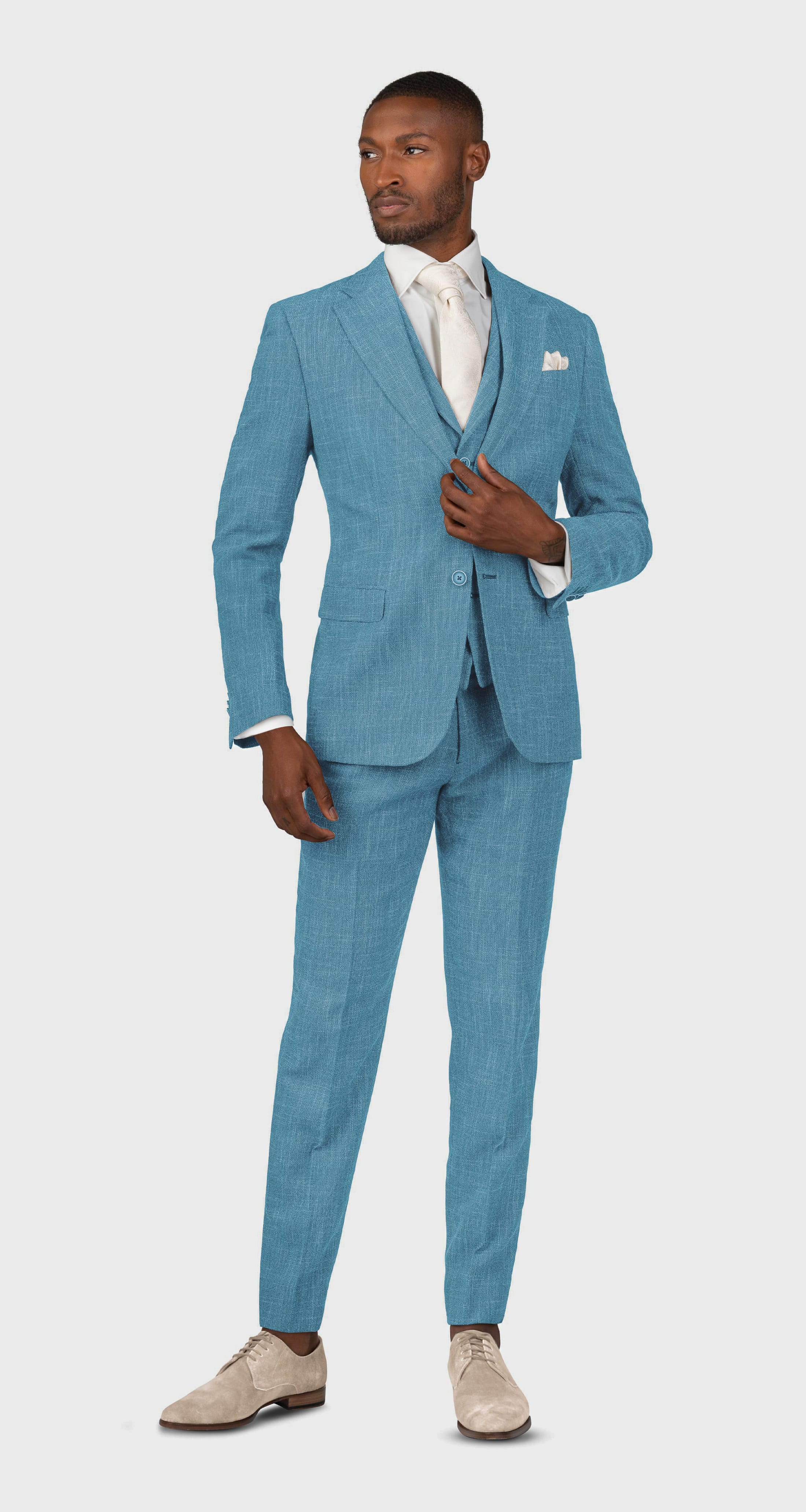 A beautiful Weddingsuit in the color acqua from the brand ROKA, this is a three-piece suit with matching waistcoat. The back of the waistcoat is made of the same fabric as the suit. this gives the suit a very luxurious look. The pants of the suit have no pleats and have an exceptionally good fit, which was specially developed by ROKA.